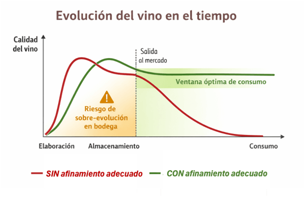 Un vino correctamente afinado y pensado, mantiene su frescura, equilibrio y carácter varietal durante más tiempo. Esto permite a la bodega ganar flexibilidad comercial: puede adaptarse mejor a los tiempos del mercado, reducir la presión para vender rápidamente y asegurar que cada botella abierta por el consumidor refleje fielmente la calidad y el estilo buscado.